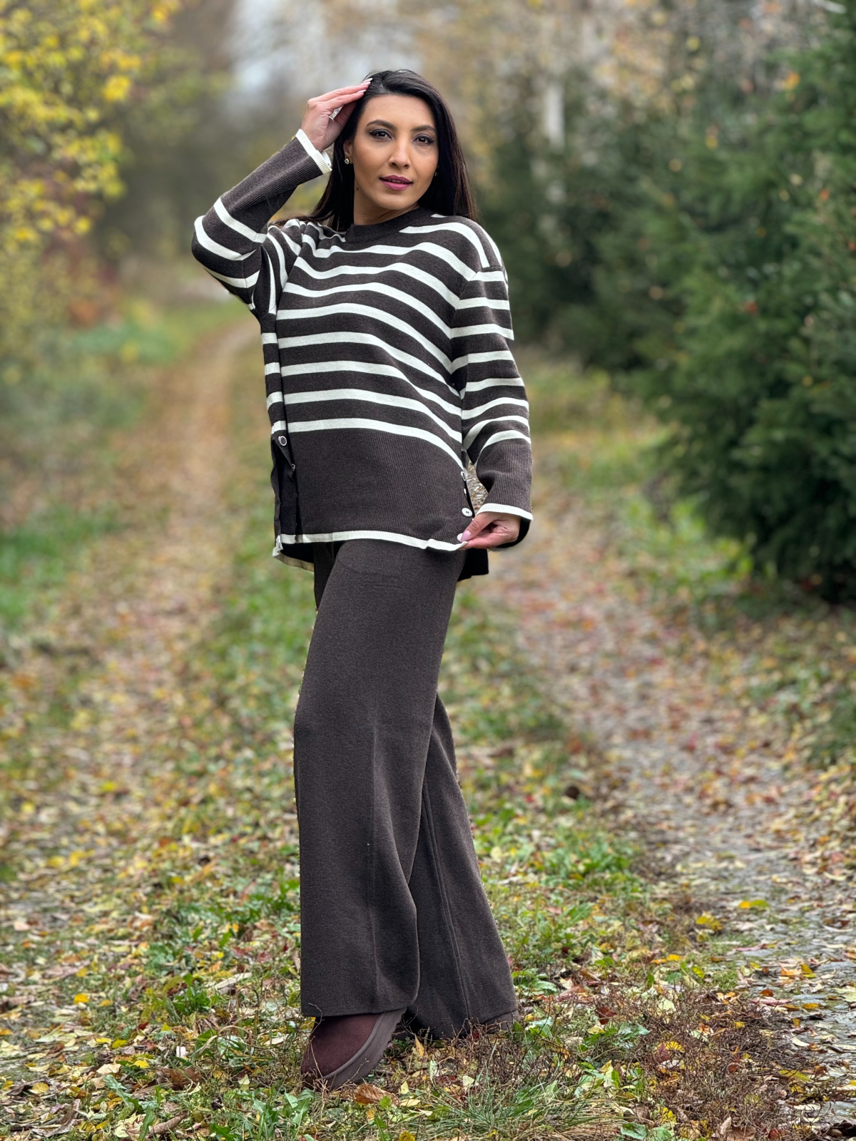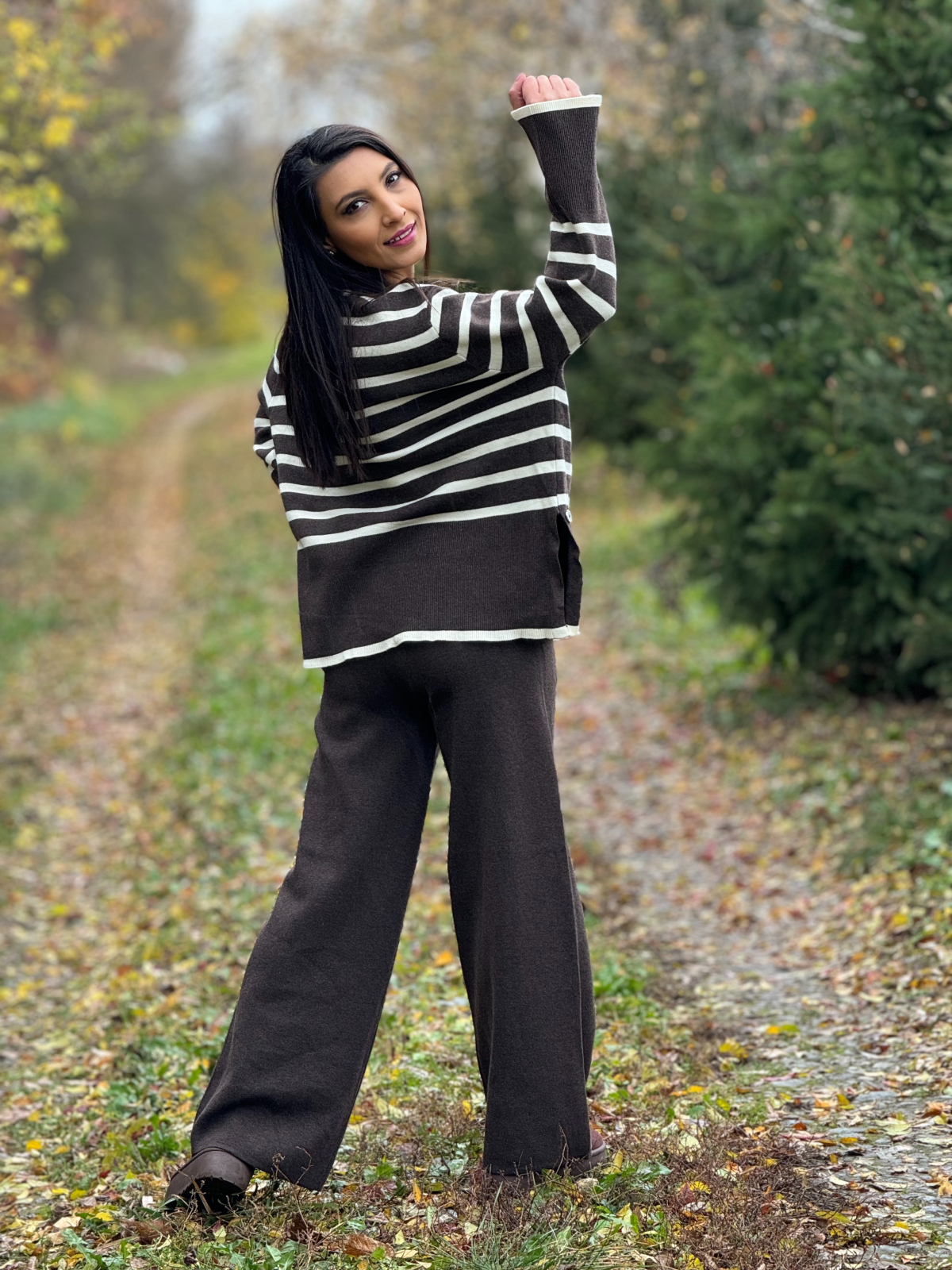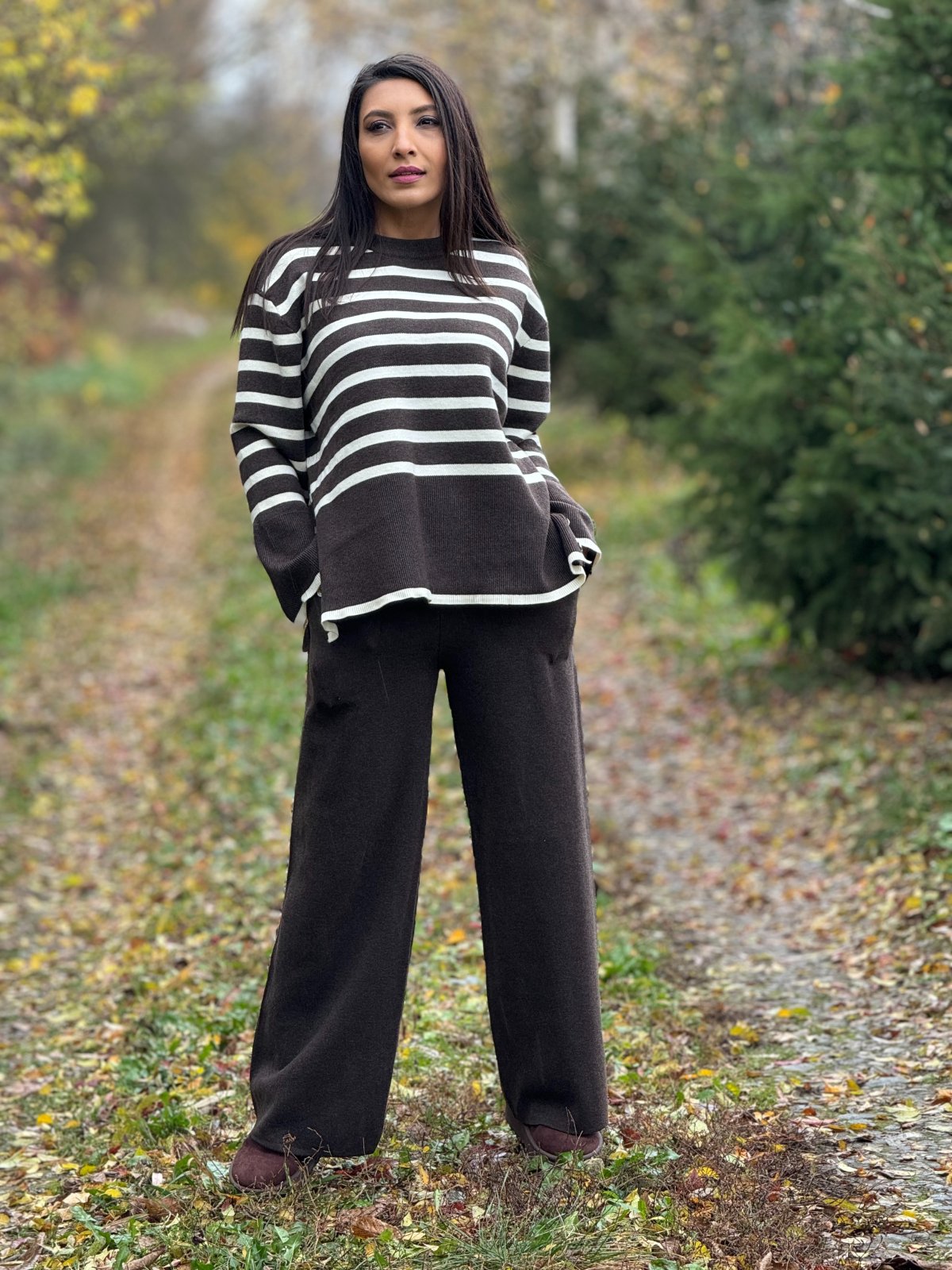 Maro-ul este culoarea siguranței, a pământului, a tot ceea ce ne ancorează și ne liniștește. În acest compleu tricotat, cu dungi orizontale fine și o croială relaxată, regăsești exact acel sentiment de apartenență și confort. Este ținuta perfectă pentru femeia care își cunoaște valoarea și nu simte nevoia să demonstreze – pentru că deja o transmite prin prezență.