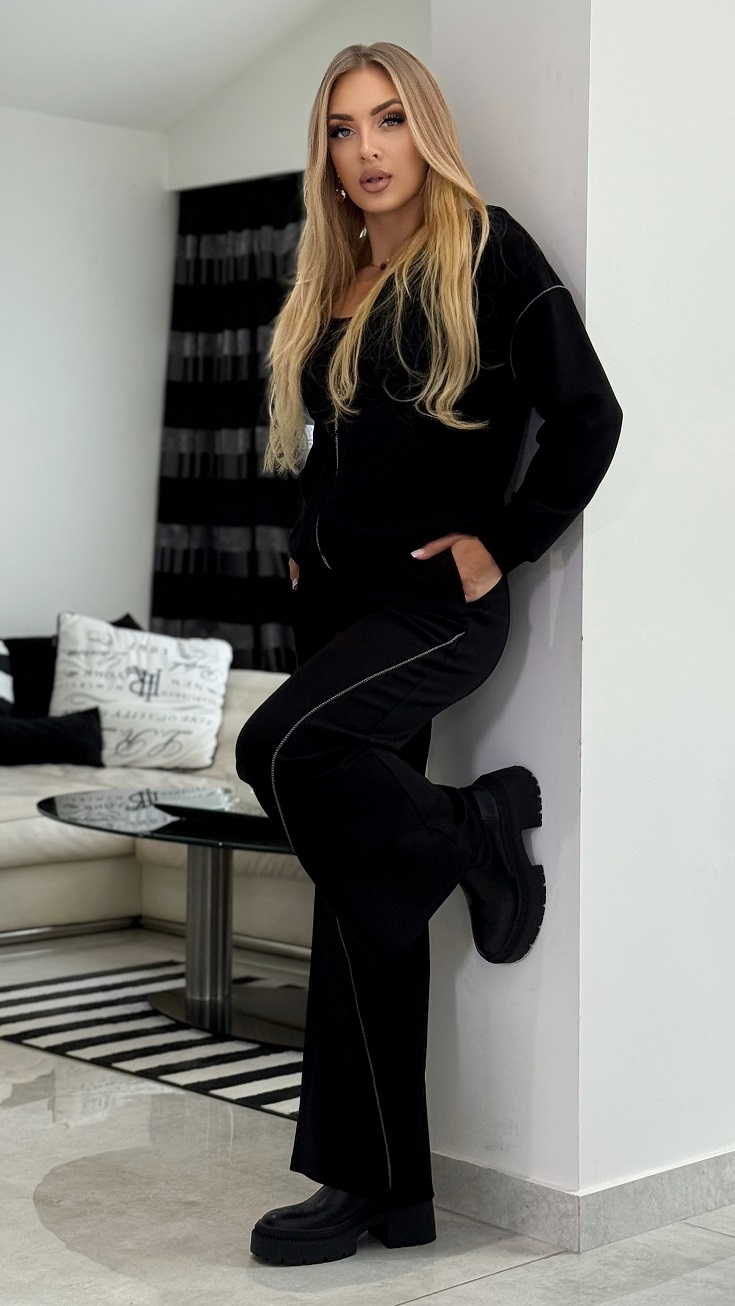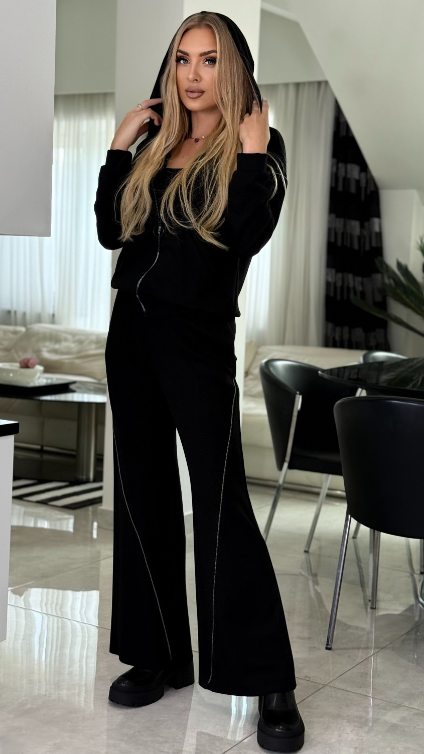 Imaginează‑ţi o dimineaţă în care vrei să te simţi liberă, alături de confortul pe care îl meriţi. Acest set negru cu glugă şi fermoar multicolor e exact pentru acele momente: când vrei ceva simplu, dar care spune „eu ştiu să mă port cu graţie, chiar şi atunci când aleg relaxarea”.