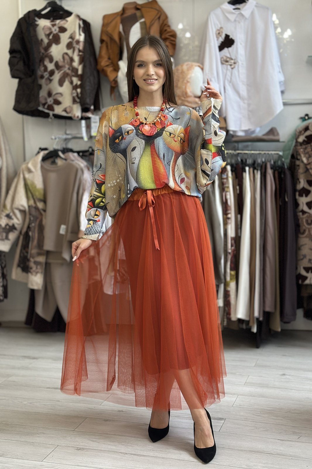 Inspirată din tonurile calde ale toamnei, fusta lungă cărămizie din tulle este o piesă care adaugă romantism și eleganță garderobei tale. Cu fiecare pas, materialul vaporos dansează în jurul tău, oferindu-ți o siluetă delicată și un aer visător.