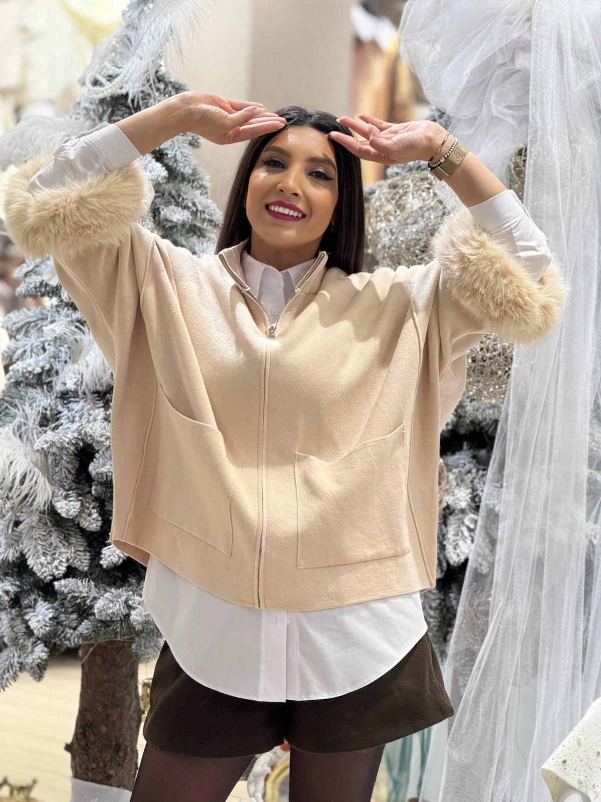 Această jachetă bej cu blăniță la mâneci nu e doar frumoasă – e pur și simplu... potrivită. Potrivită pentru o plimbare într-o zi mohorâtă, pentru o ieșire cu prietenele sau pentru un eveniment unde vrei să arăți bine fără să pari că ai încercat prea mult. Buzunarele mari sunt gata să-ți adăpostească mâinile sau micile tale comori, iar felul în care se așază pe corp te face să te simți ușoară, feminină, sigură pe tine.