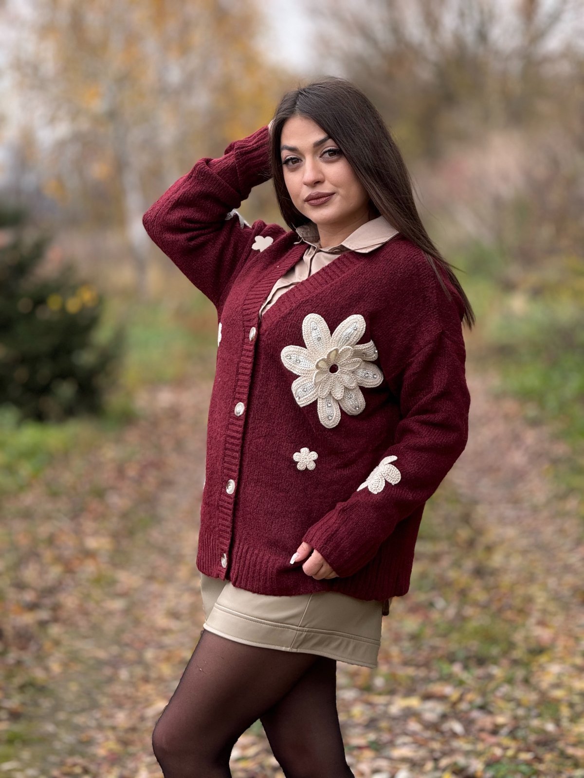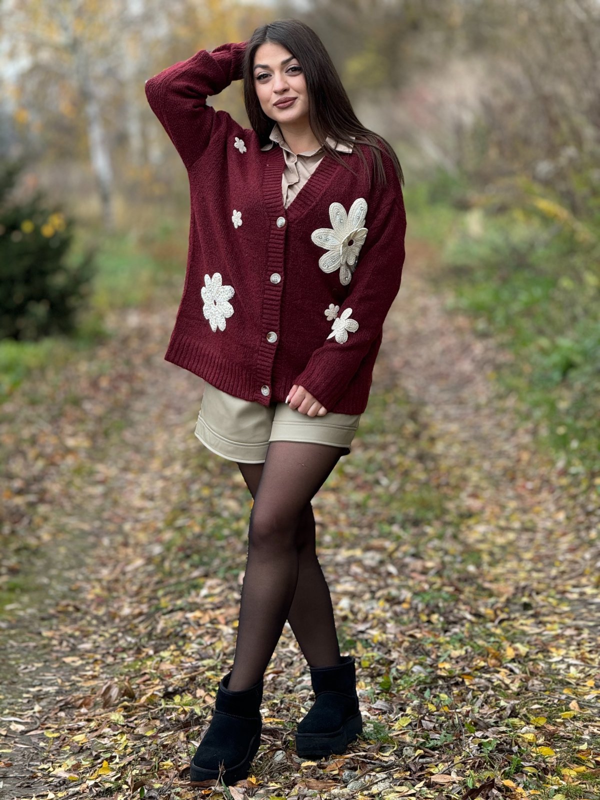 Imaginează‑ți acea seară caldă de toamnă, când culorile se adâncesc şi lumea încetineşte puţin. În acele momente, alegi această jachetă bordo cu aplicaţii florale croşetate — o piesă care spune că ai ales să te simţi frumoasă, în propria ta lumină. Bordo‑ul ei intens îmbrăţişează feminitatea matură şi sofisticată, iar florile croşetate adaugă textura unei poveşti delicate – a ta, spusă în linişte.