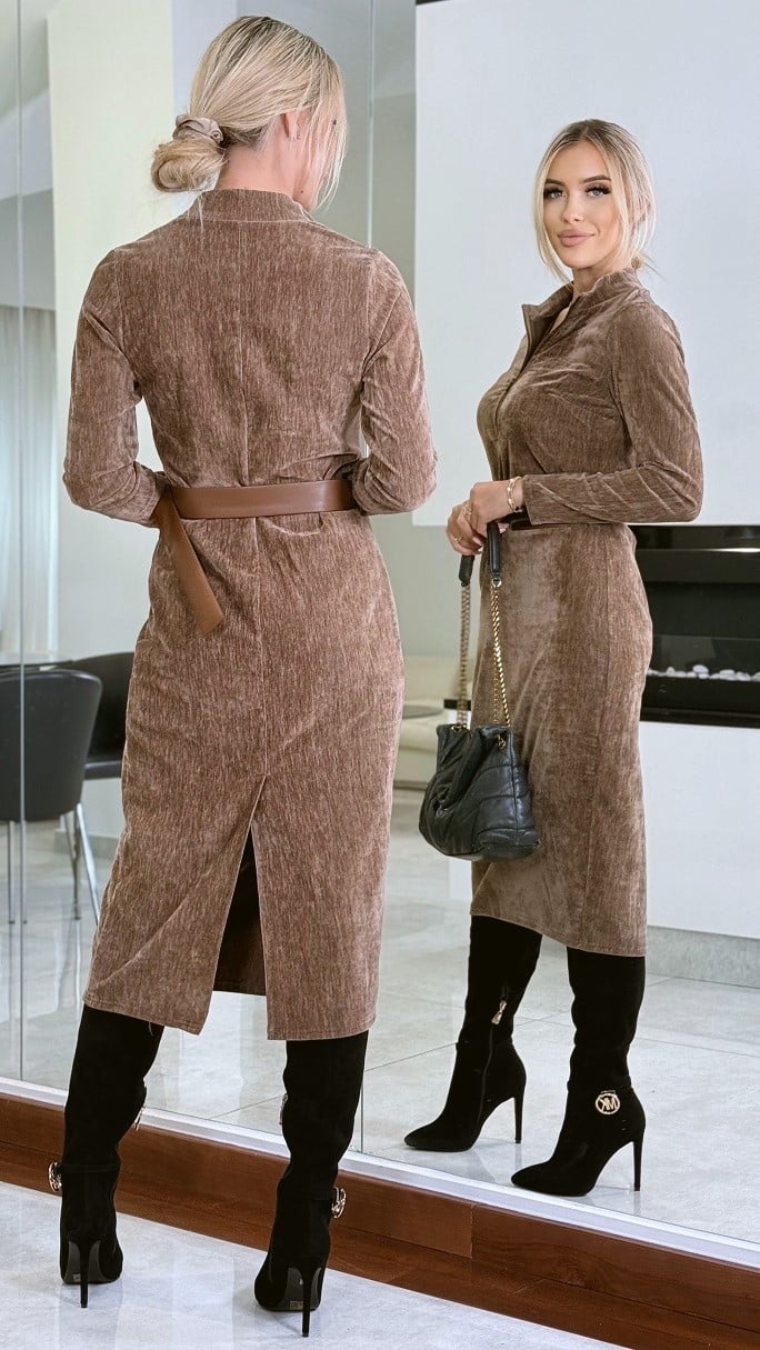 Această rochie din catifea maro este despre tine — femeia care știe când să fie delicată și când să strălucească în tăcere. Catifeaua moale te învăluie cu o atingere blândă, iar nuanța caldă de maro îți dă acel sentiment de siguranță, stabilitate și rafinament matur.