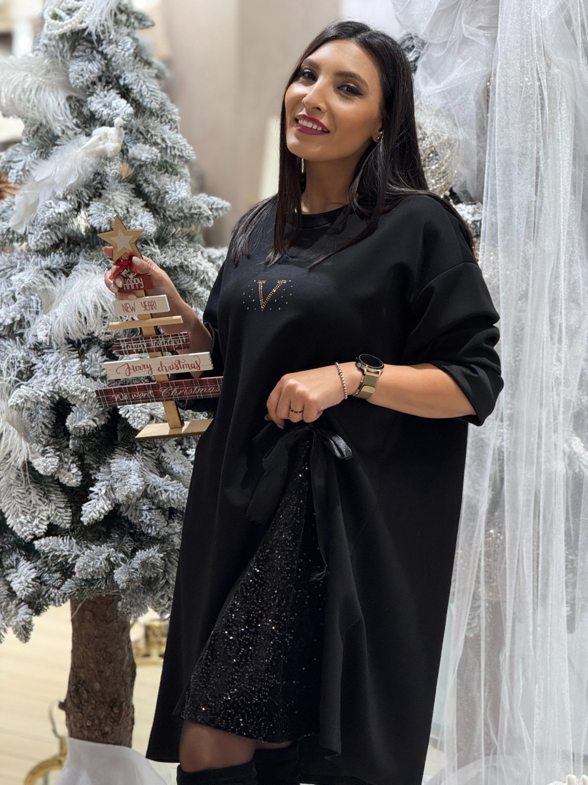 Unele rochii nu sunt doar haine – sunt stări de spirit. Această rochie neagră pare simplă la prima vedere, dar ascunde în fiecare detaliu un strop de magie. Inserția laterală din paiete captează lumina în pași mici, timizi, ca și cum ar păstra un secret al eleganței care nu strigă, ci șoptește. Iar aplicațiile discrete din pietricele sunt ca niște stele pe un cer întunecat: fine, dar imposibil de ignorat.