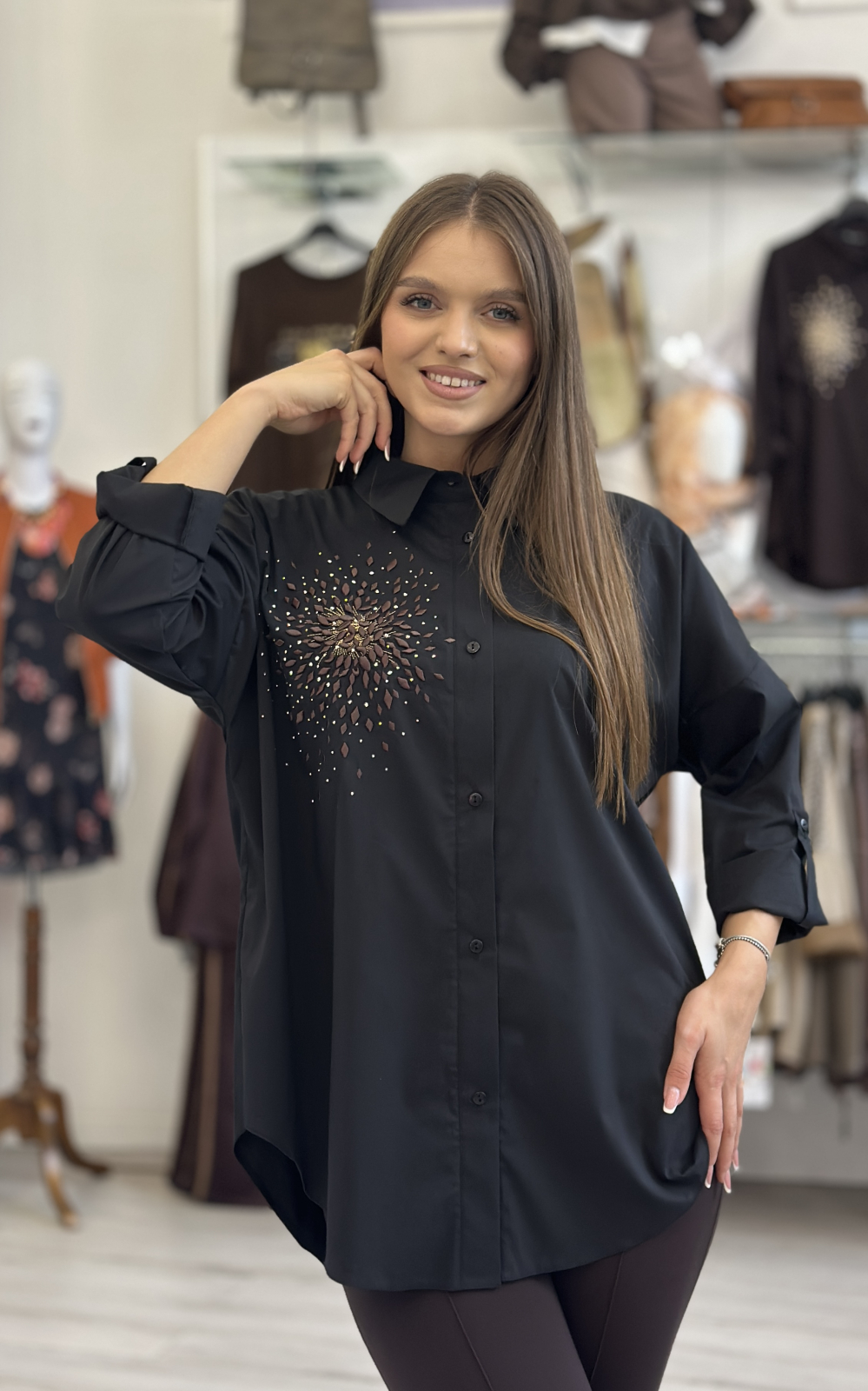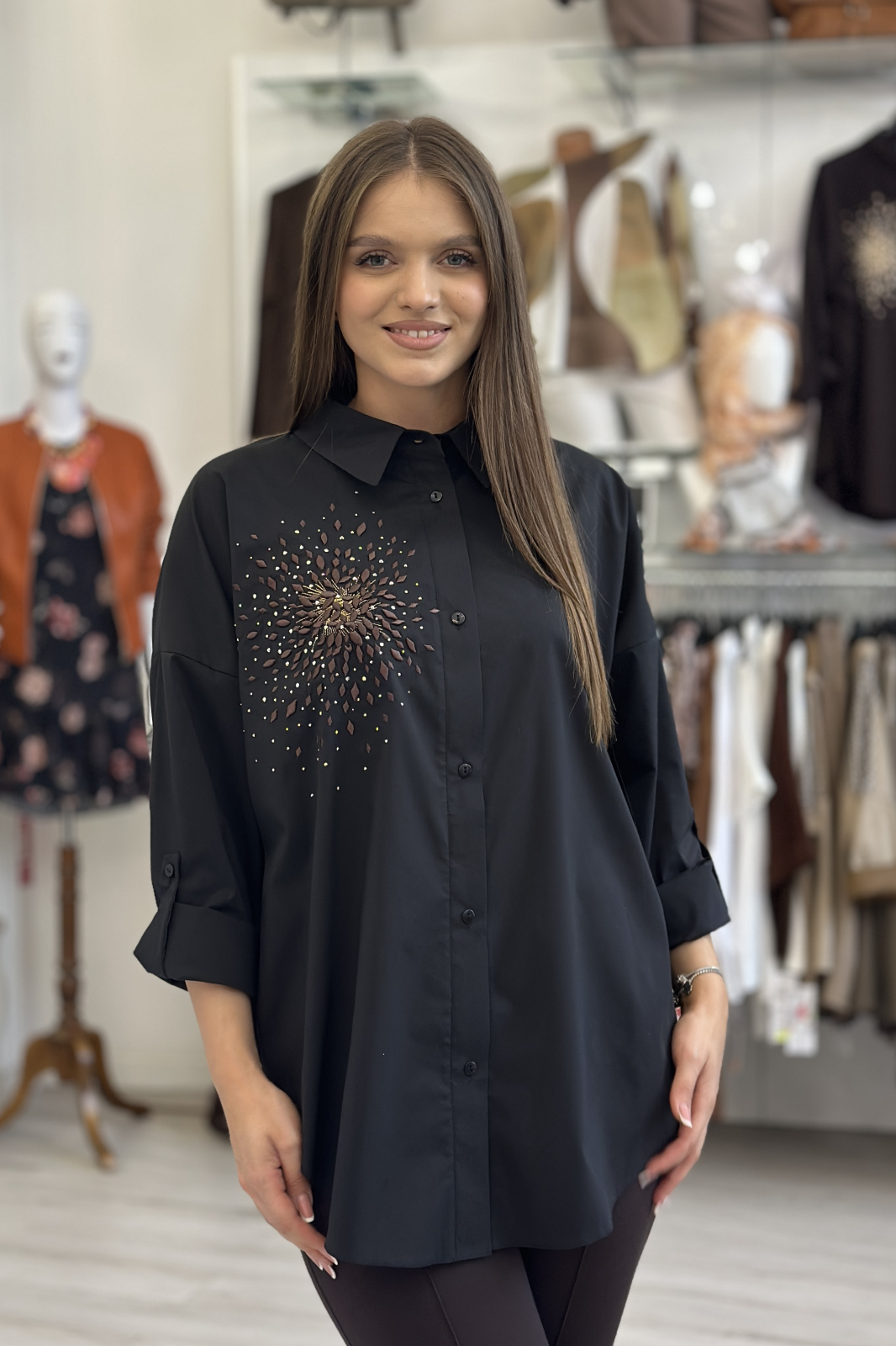 Această cămașă neagră din bumbac impresionează prin broderia maro cu accente discrete de pietricele, oferind o notă caldă, elegantă și în același timp ușor extravagantă. Este o piesă versatilă, ideală pentru zilele în care vrei să ieși din tipare fără a renunța la confortul unui material natural.