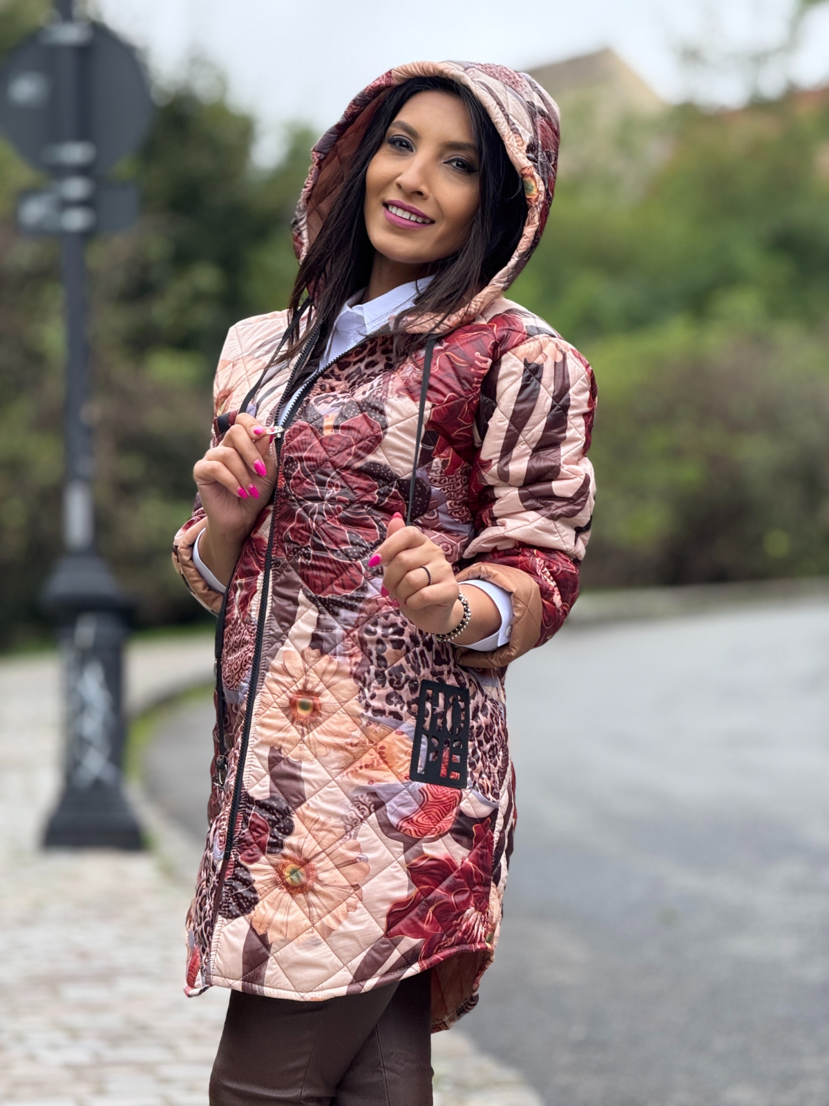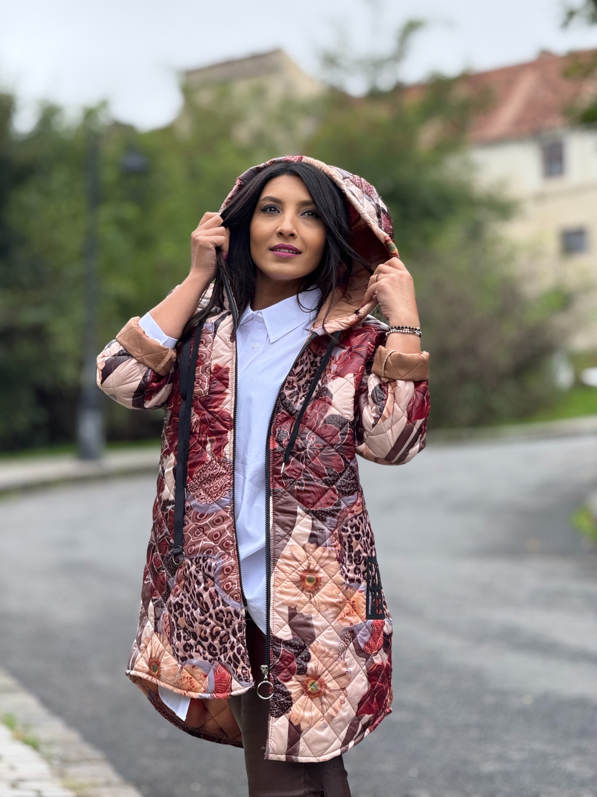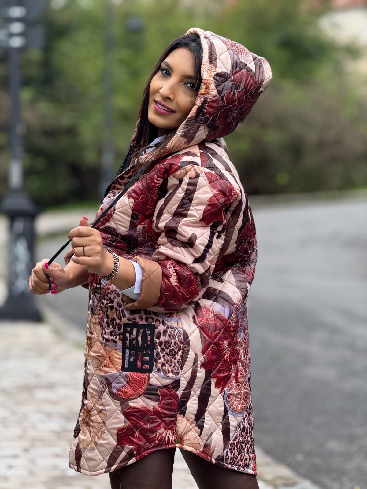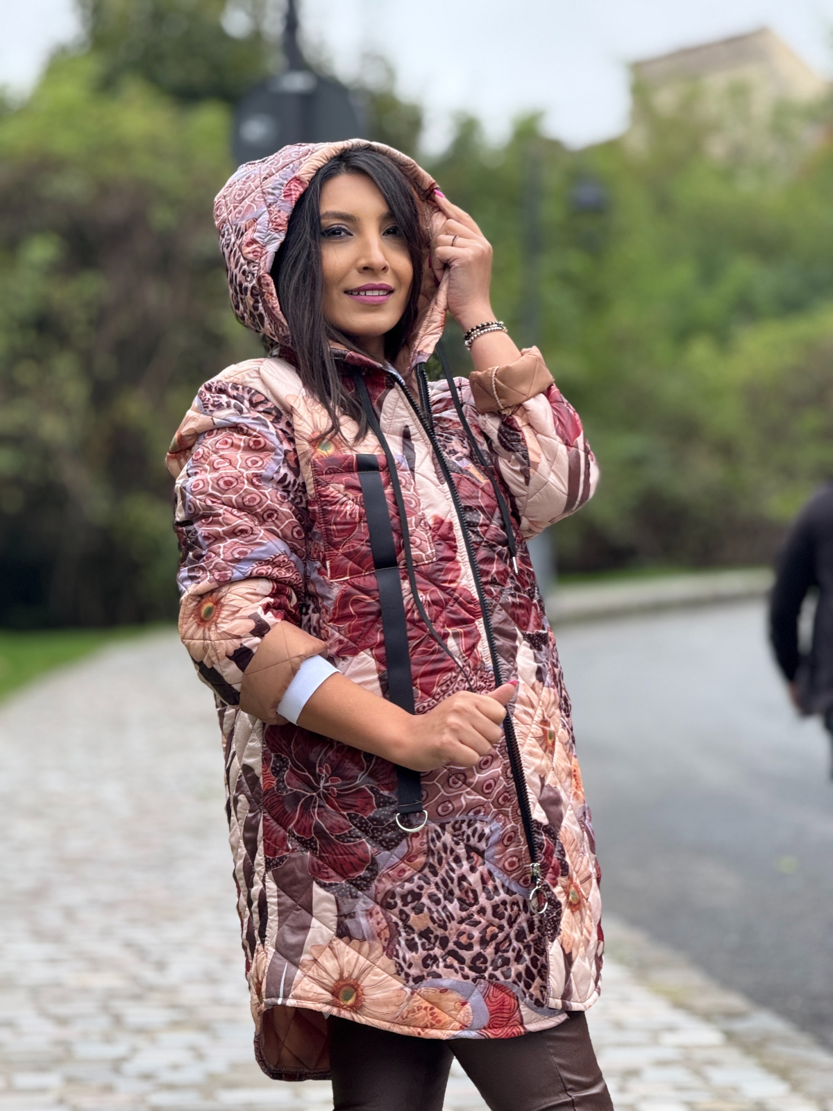 Nuanța bej conferă o bază neutră, elegantă și ușor de asortat, iar imprimeul floral aduce un strop de feminitate și prospețime — nu un pattern agresiv, ci o sugestie delicată ce însoțește mișcările tale. Lungimea geacei creează un efect de alungire a siluetei și oferă protecție suplimentară împotriva vântului sau temperaturilor imprevizibile.