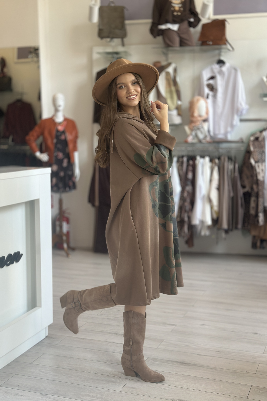 Rochie maro tip hanorac cu buzunare si imprimeu floral