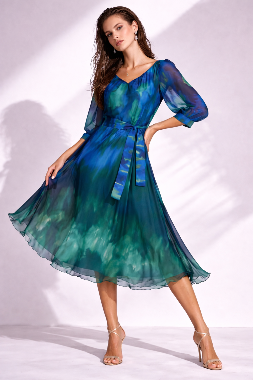 Rochie midi albastra in degrade cu manecuta