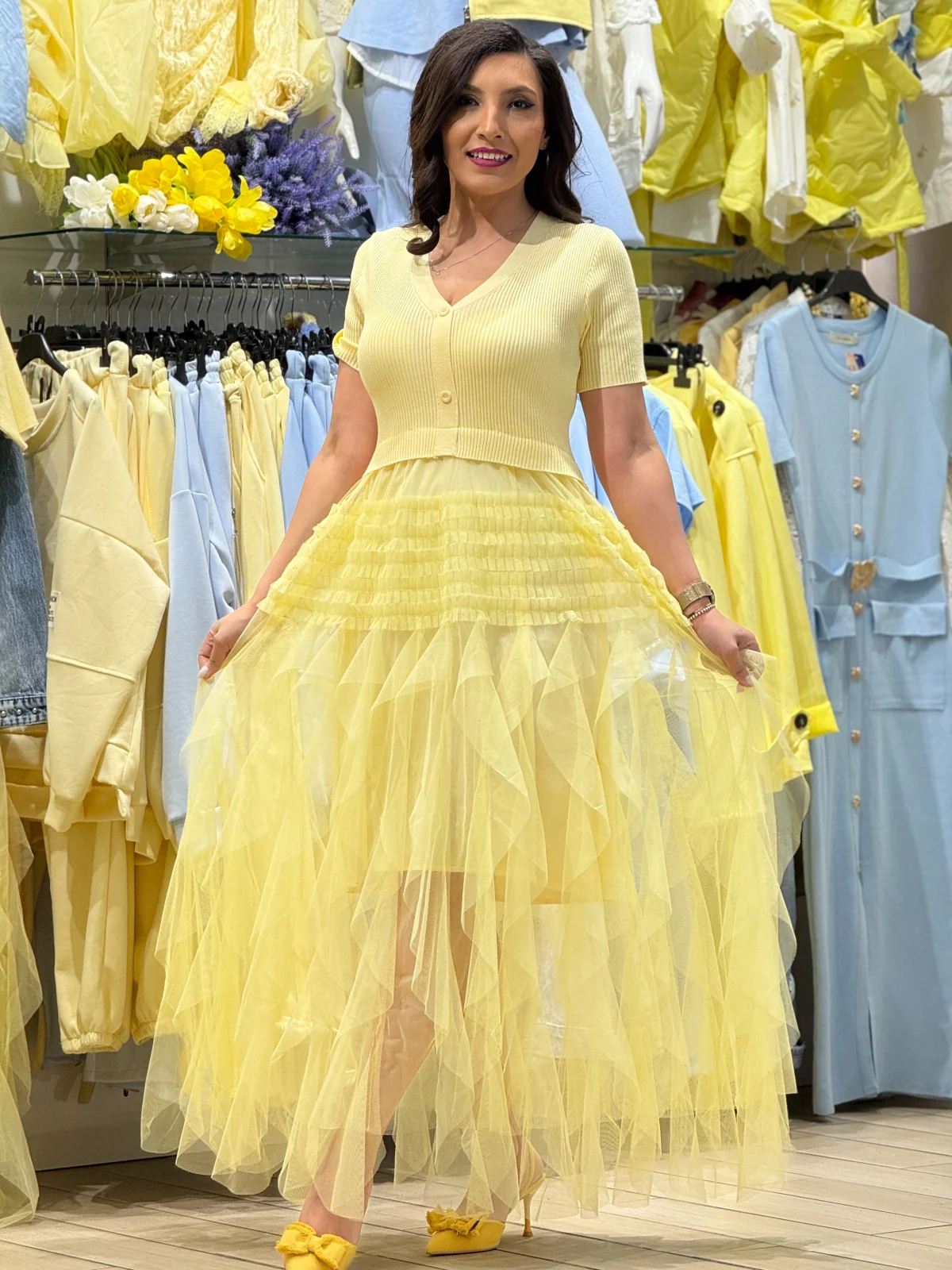 Dantela fină oferă rafinament și un aer romantic, iar volănașele adaugă dinamism și fluiditate fiecărei mișcări. Nuanța galbenă luminează tenul și aduce un plus de prospețime, transformând această rochie într-o piesă ideală pentru sezonul cald. Croiala este gândită pentru confort, punând în valoare silueta fără a pierde din lejeritate.