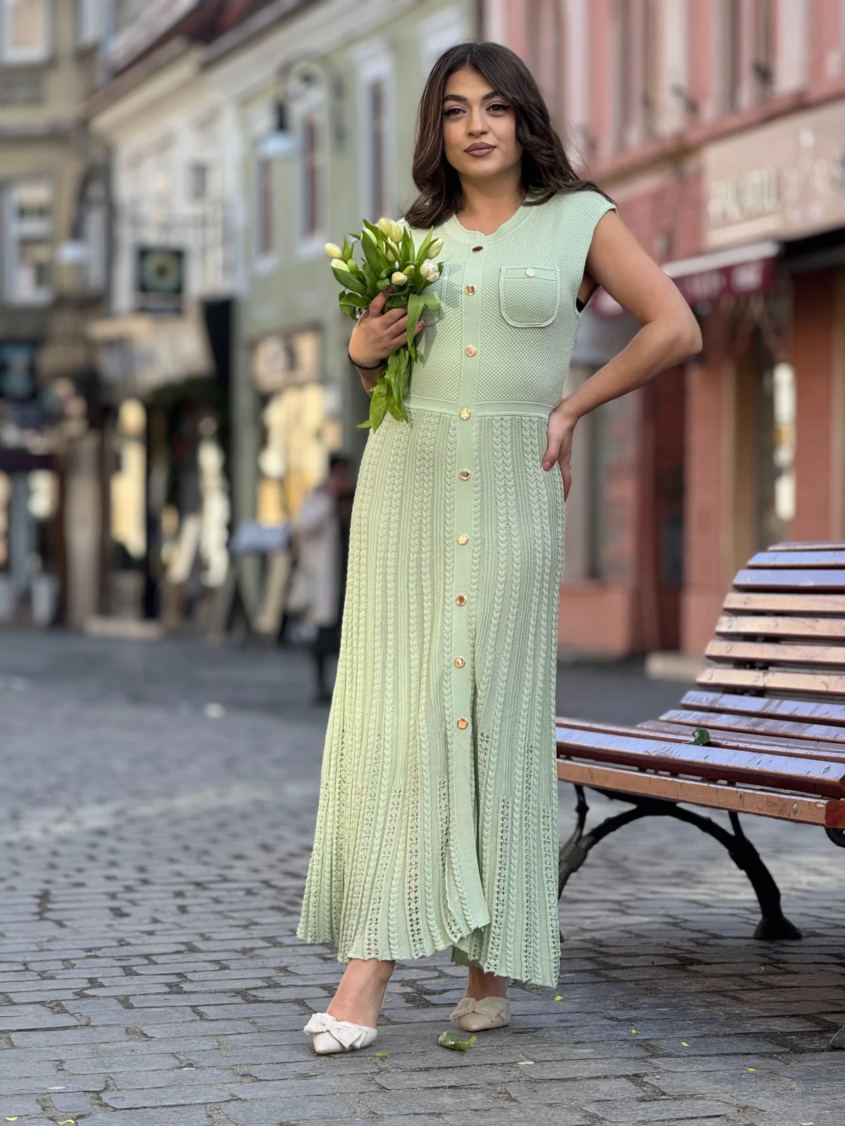 Nuanța verde mentă inspiră prospețime și delicatețe, fiind ideală pentru sezonul cald. Croiala tip maiou oferă lejeritate și libertate de mișcare, iar detaliile perforate adaugă un plus de rafinament și subtilitate designului. Aceste elemente creează un joc discret de texturi, transformând o rochie simplă într-o piesă cu personalitate.