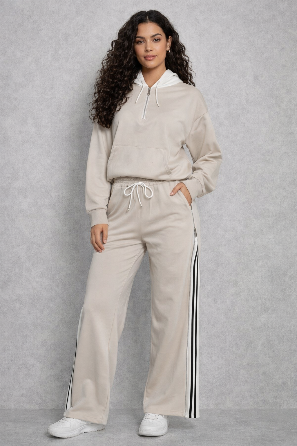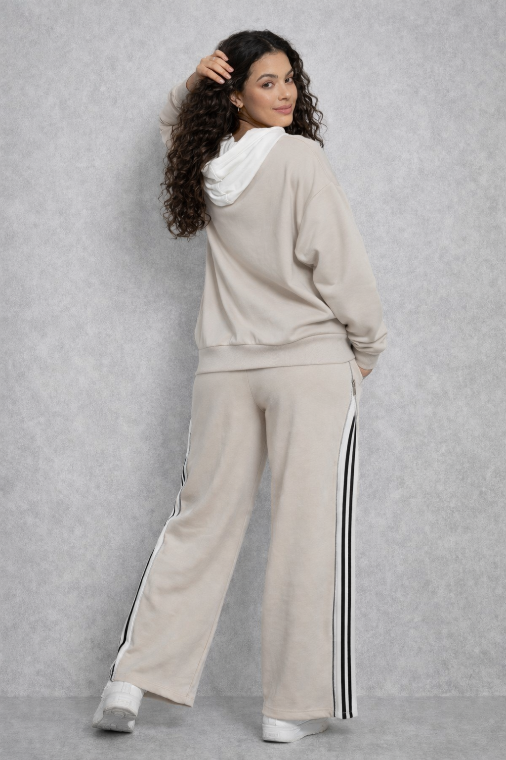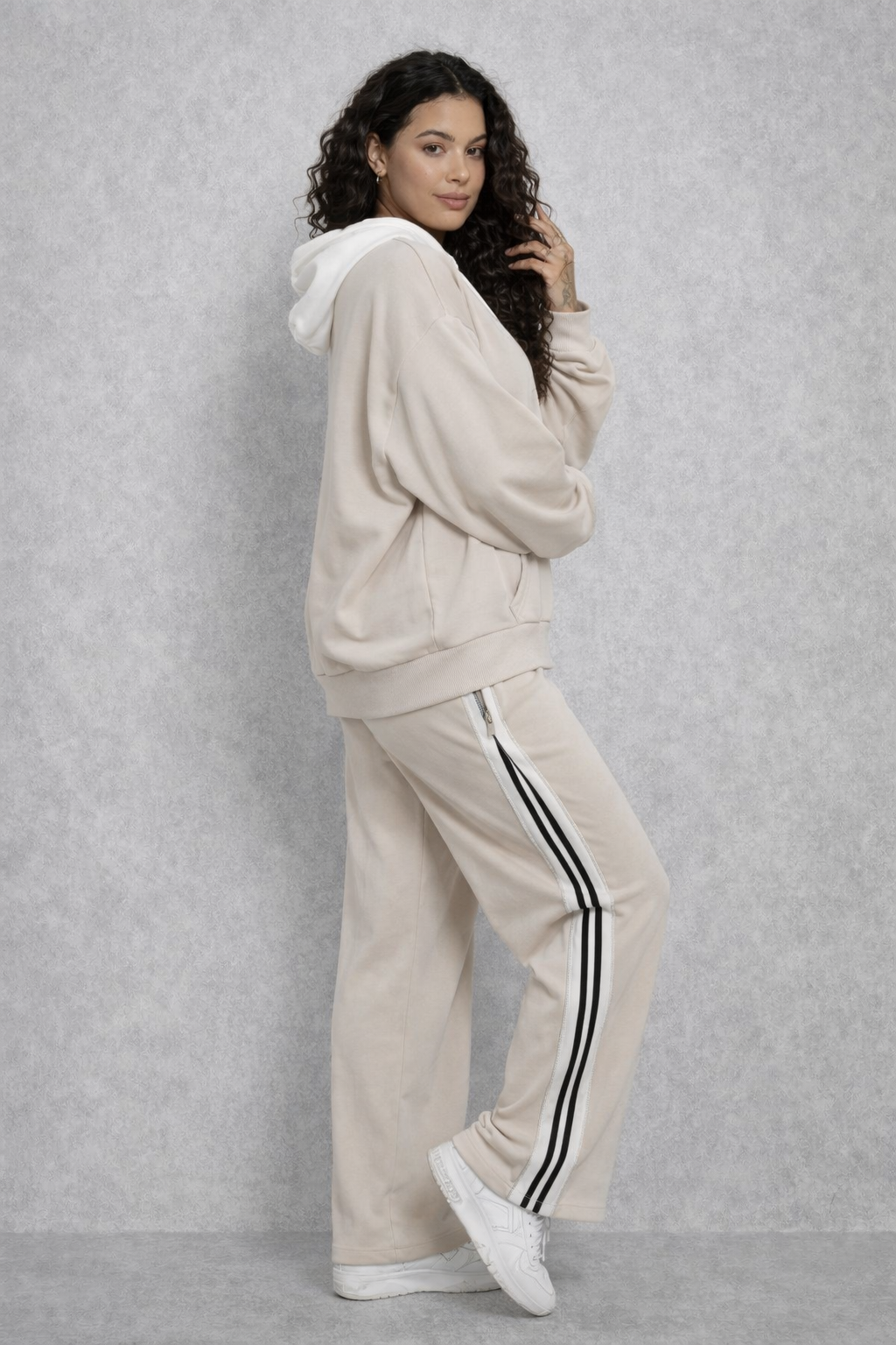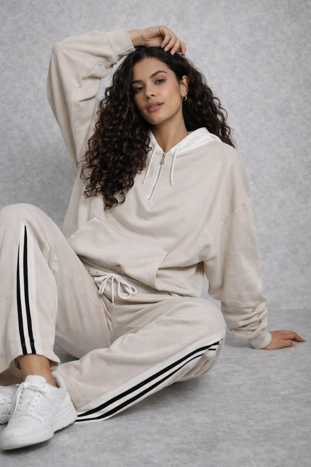 Confortul poate fi și chic – iar acest trening bej cu glugă albă o dovedește din plin. Este ideal pentru femeia care vrea să se simtă relaxată, dar în același timp chic, fie că e acasă, la o plimbare sau în drum spre cafeneaua preferată. Croiala lejeră se adaptează armonios siluetei, iar contrastul delicat dintre bej și alb aduce o notă de prospețime și rafinament.
