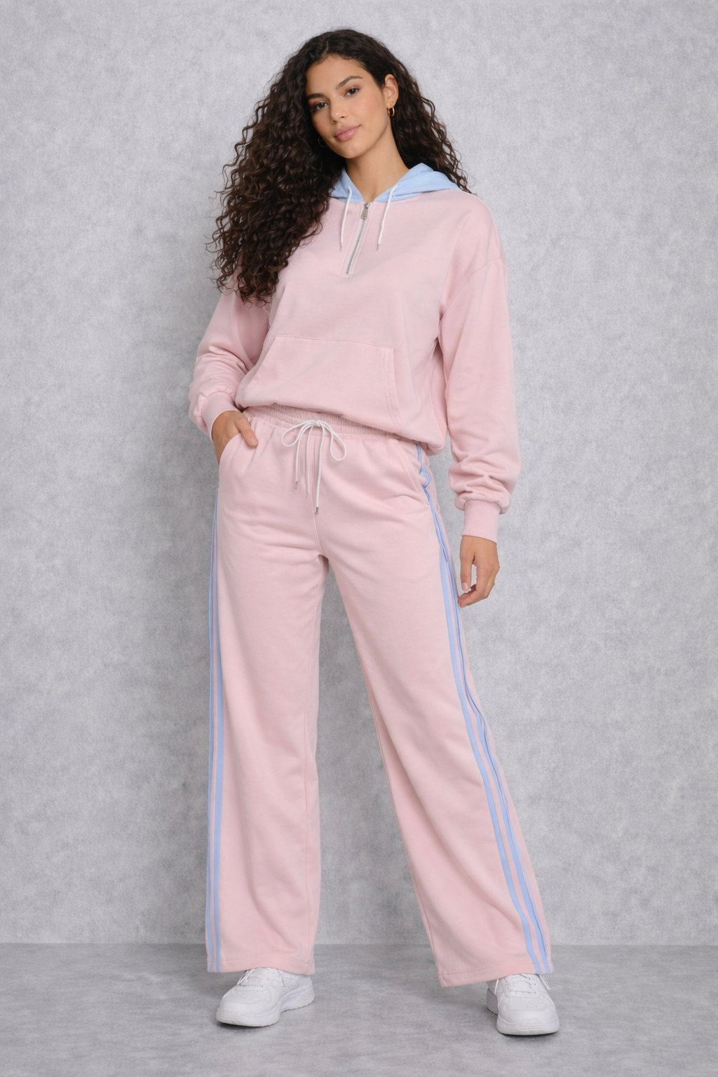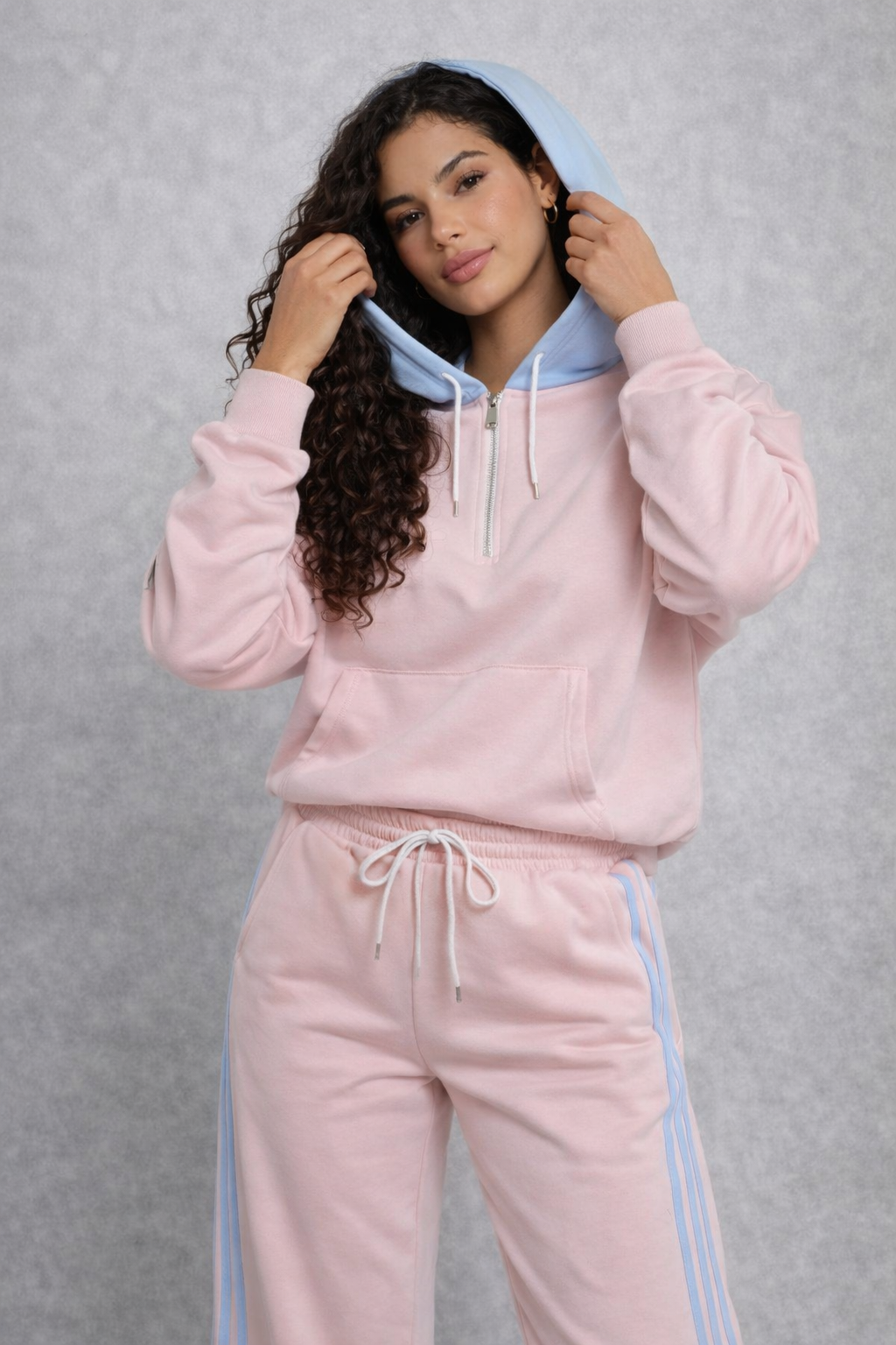 Fiecare zi devine mai frumoasă când te simți confortabil în pielea ta. Treningul roz cu glugă bleu este alegerea perfectă pentru femeia care îmbină feminitatea cu un stil relaxat, fără compromisuri. Nuanța roz delicat aduce un aer jucăuș și proaspăt, în timp ce gluga bleu adaugă un contrast modern și plin de stil.