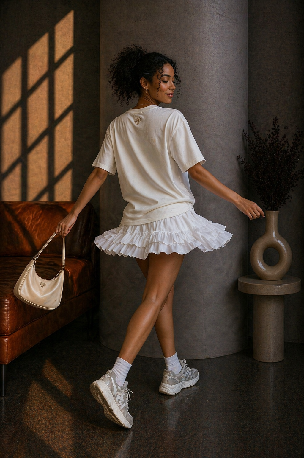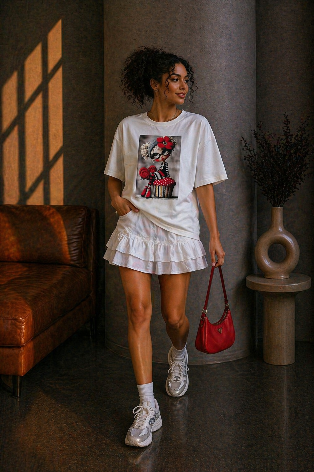 Tricou dama alb din bumbac cu imprimeu fetita cu bentita rosie