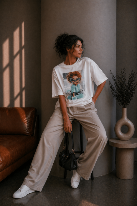 Tricou dama ivory din bumbac cu imprimeu fata cu par cret