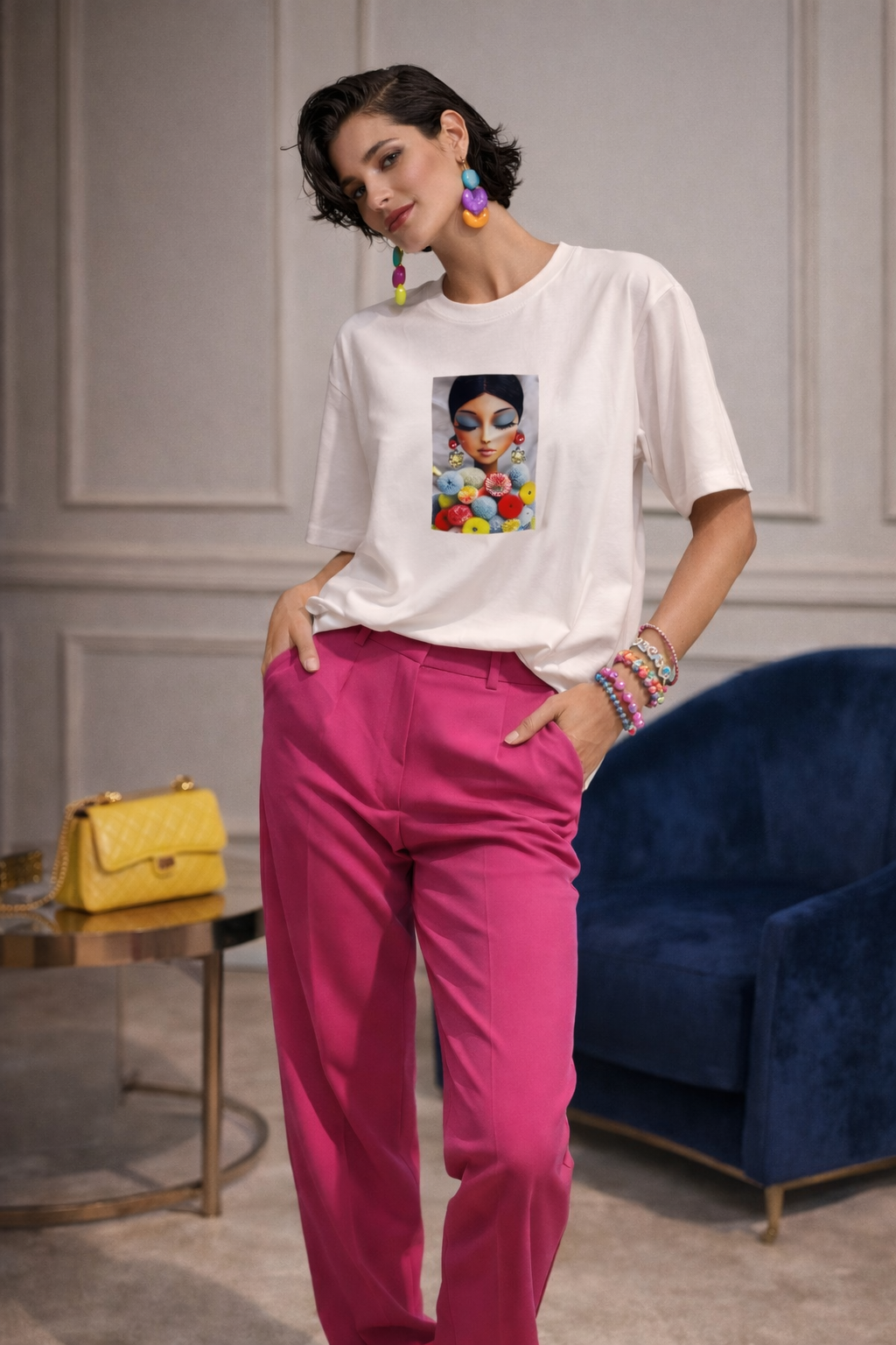 Imprimeul multicolor aduce un plus de culoare și vitalitate ținutei, transformând un tricou clasic într-o piesă statement. Poate fi purtat cu jeanși pentru un look casual modern sau integrat într-o ținută smart-casual cu sacou și pantaloni eleganți.