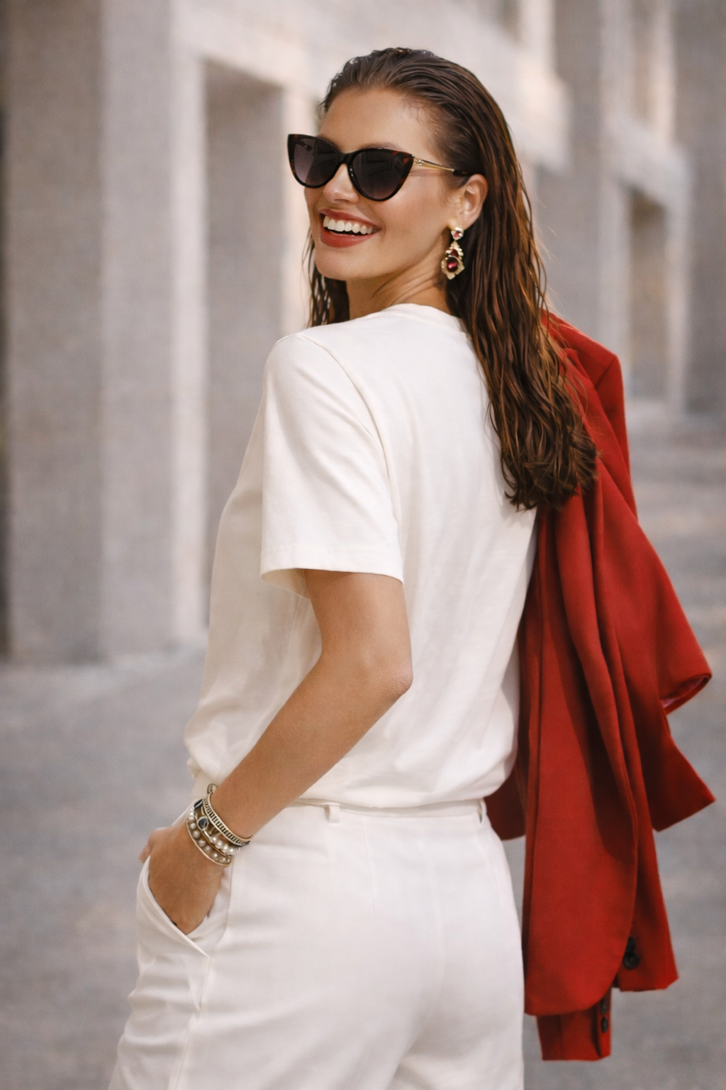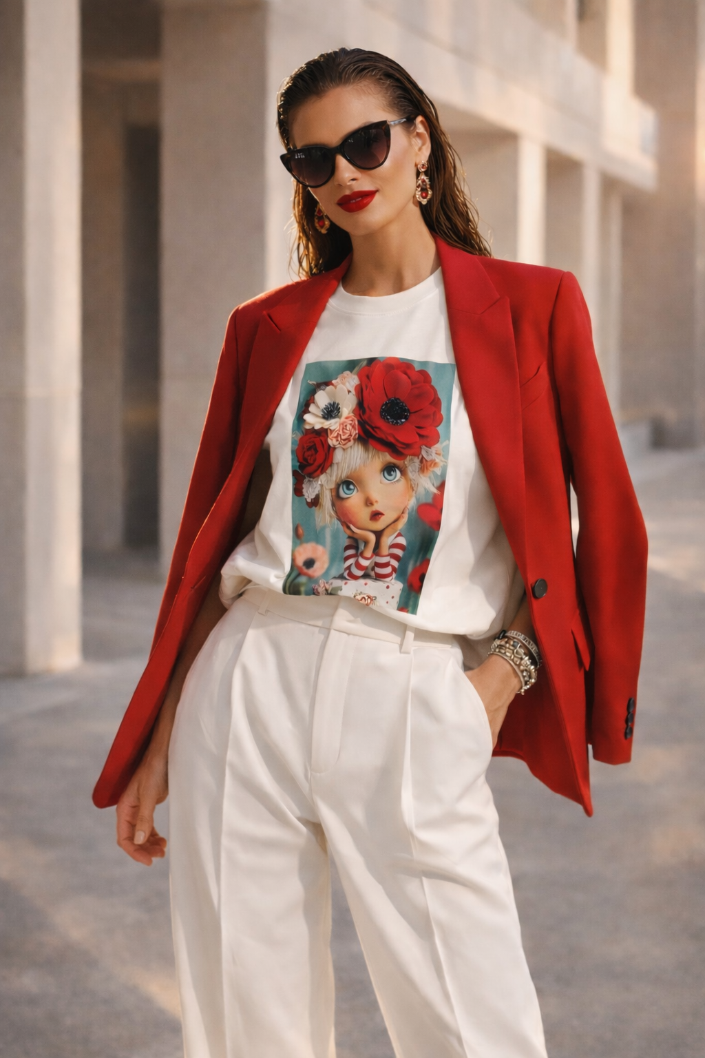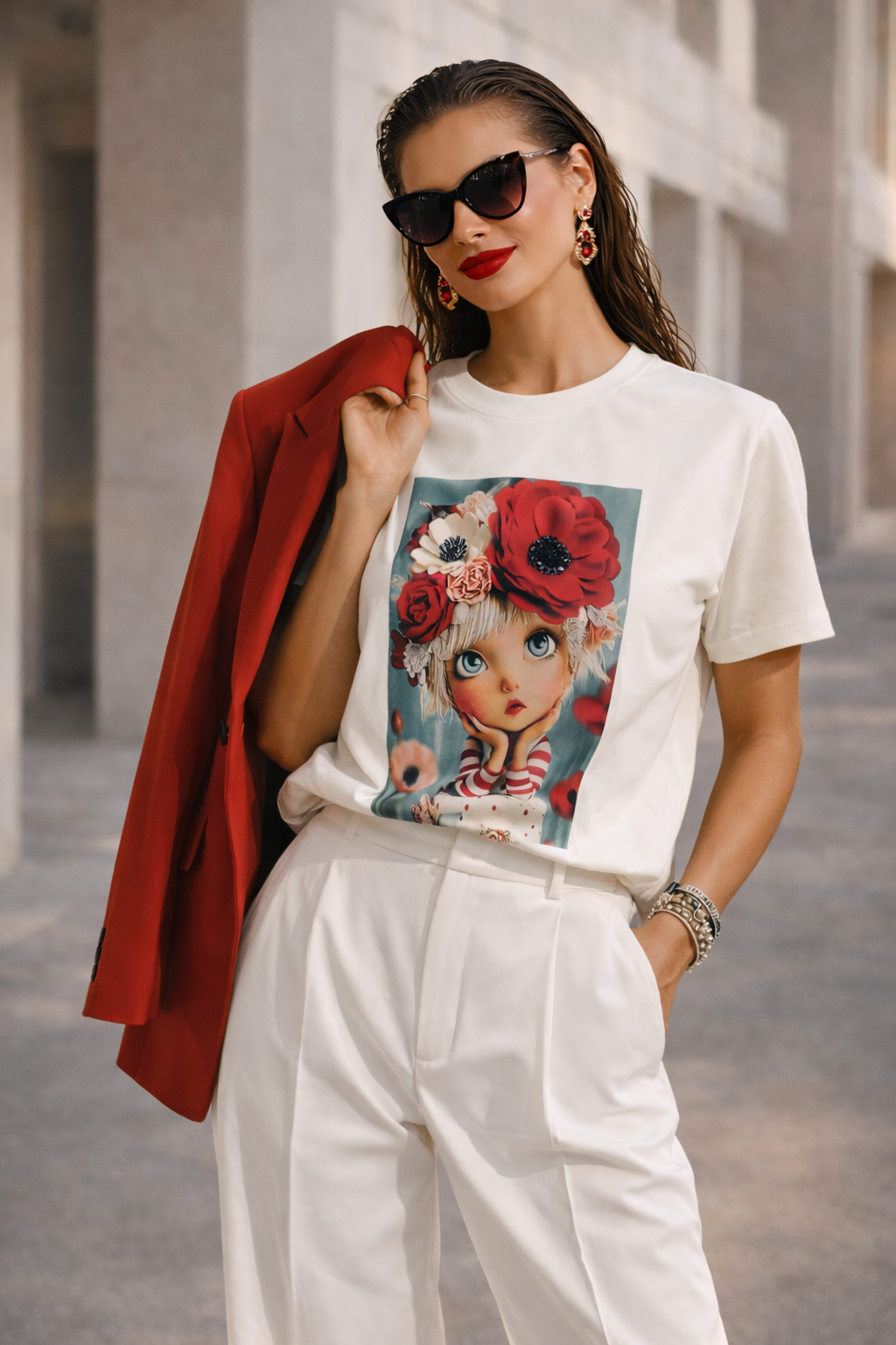 Tricou dama ivory din bumbac cu imprimeu fata cu coronita de flori