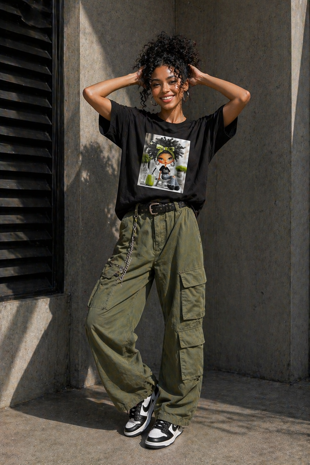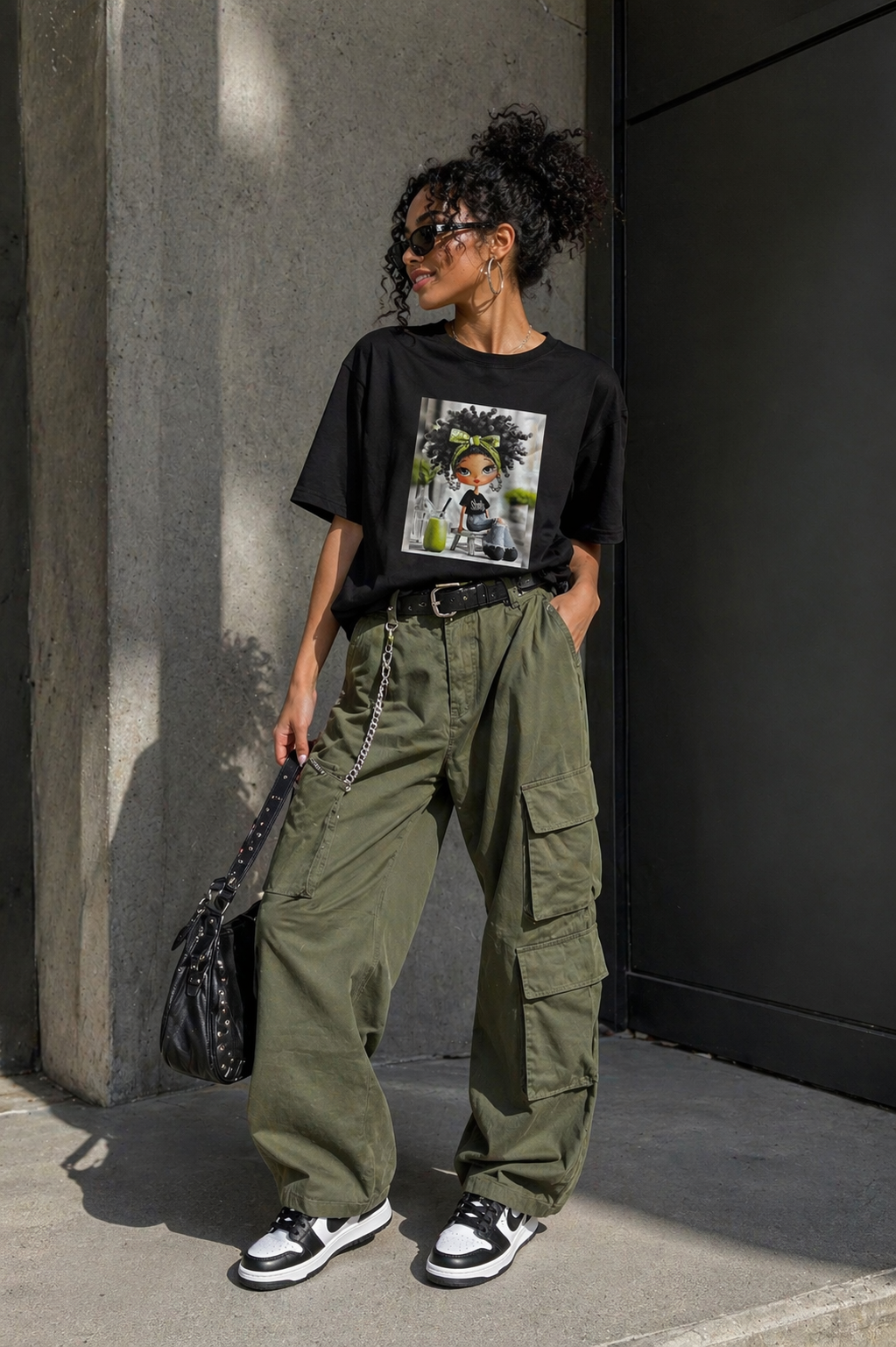 Tricou dama negru din bumbac cu imprimeu fetita cu milkshake