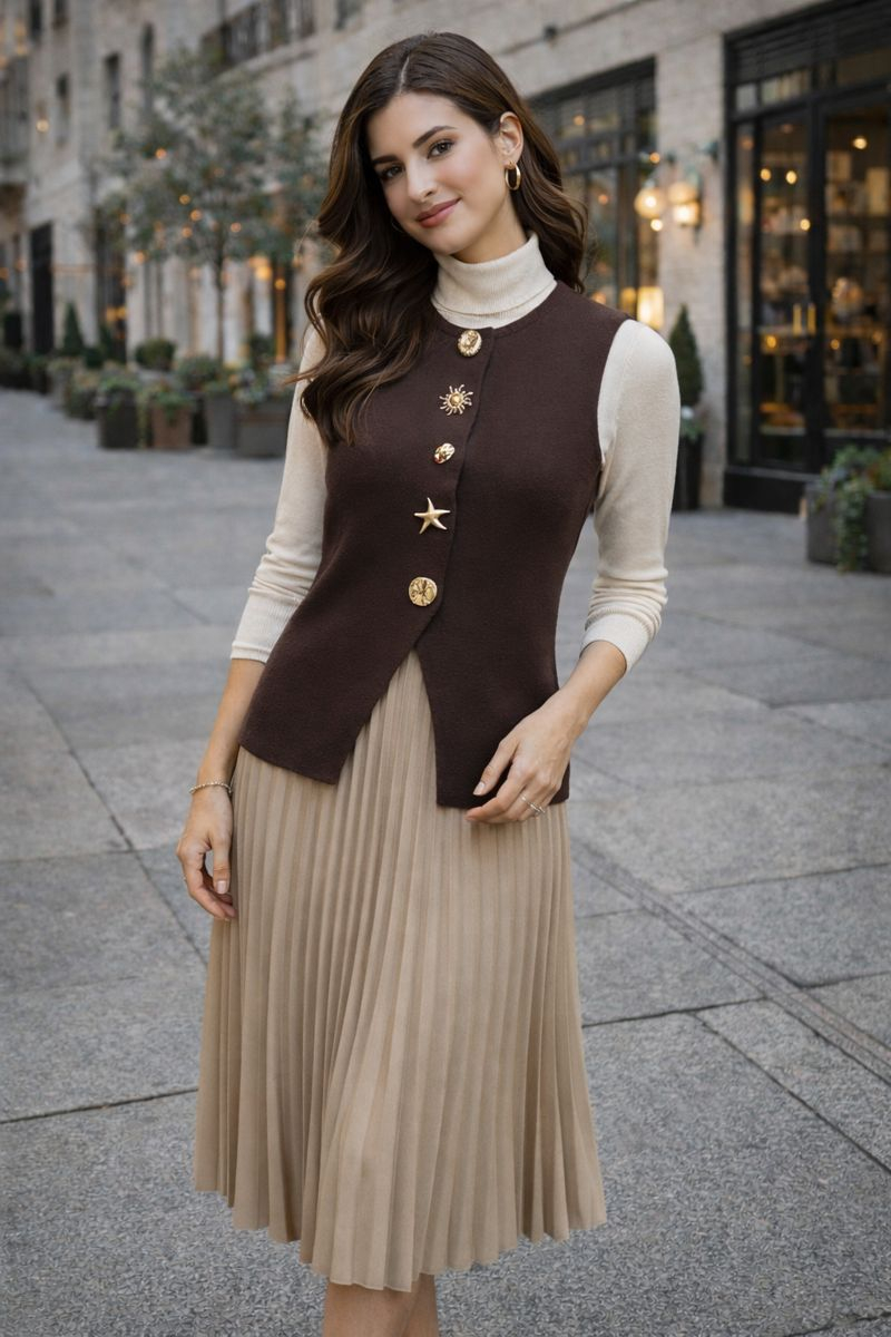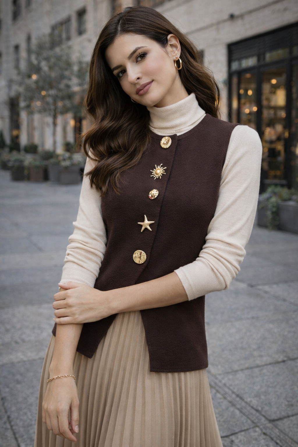 Cauți o piesă versatilă, cu un strop de magie în detalii? Această vestă maro este alegerea ideală pentru femeia care adoră simplitatea cu personalitate. Ce o face specială? Cei cinci nasturi aurii – fiecare cu o formă diferită: de la simbolul soarelui, la libelulă și alte motive inspirate din natură, toate atent alese pentru a transmite feminitate, vitalitate și unicitate.
